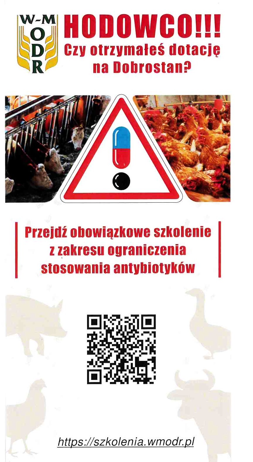 Szkolenia dotyczące metod ograniczających stosowanie antybiotyków w produkcji zwierzęcej organizują Centrum Doradztwa Rolniczego (CDR) lub wojewódzkie Ośrodki Doradztwa Rolniczego (ODR). Rolnik, może wybrać formę w jakie chce odbyć takie szkolenie. Jedną z nich jest metoda samokształcenia – rolnik w dogodnym dla siebie terminie bierze udział w internetowym szkoleniu dostępnym pod linkiem: https://szkoleniadlarolnika.pl/.